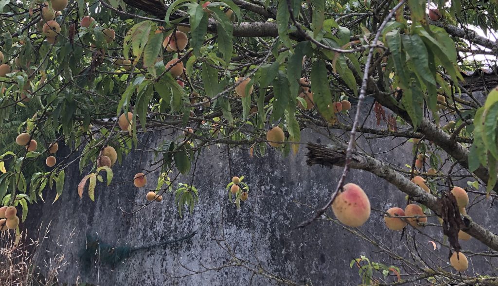 In mijn onnozelheid over fruit twijfel ik tot de dag van vandaag: is dit nou een kleine zure perzik of een fluwelige abrikoos met een perzikpit? In de boekjes en apps is alles handig te categoriseren – die zeggen dat het perzik is-, BUT IS IT? Ik heb in juni van een andere boom een (1) heerlijke perzik geoogst, daar was geen twijfel over mogelijk. Dus deze boom hangt volgens mij vol met perzikozen. Als ik er even aan schud, dan regent het rijp fruit. Ik kan dus niet wachten tot ik zeker weet wat het is en heb er inmiddels jam, zoetzure en ook pittige chutney, siroop, roomijs en sorbetijs van gemaakt. Dan weet je alvast wat je krijgt, mocht je op bezoek komen. Of ongeveer dan toch.