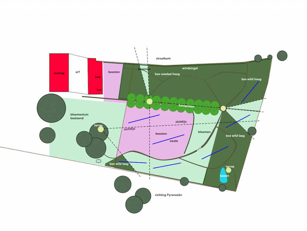 Inmiddels zijn we een stapje verder met het ontwerp van het voedselbos. Zones zorgen ervoor dat het project een beetje behapbaar wordt, als een eerste ondergrond op het doek. Het terrein wordt aan de hand van de natuurlijke hoogteverschillen en gewenste zichtlijnen ingedeeld in bomenlaan, bos, bloemenveld of beestenwei. En daarbinnen elementen als windsingels, swales (droge greppels), een vijver, paden en zitplekken. Een privépark eigenlijk. De volgende stap is dan om een concreter beplantingsplan te maken, en tegelijkertijd te beginnen met windsingels en proefveldje. Wordt vervolgd!