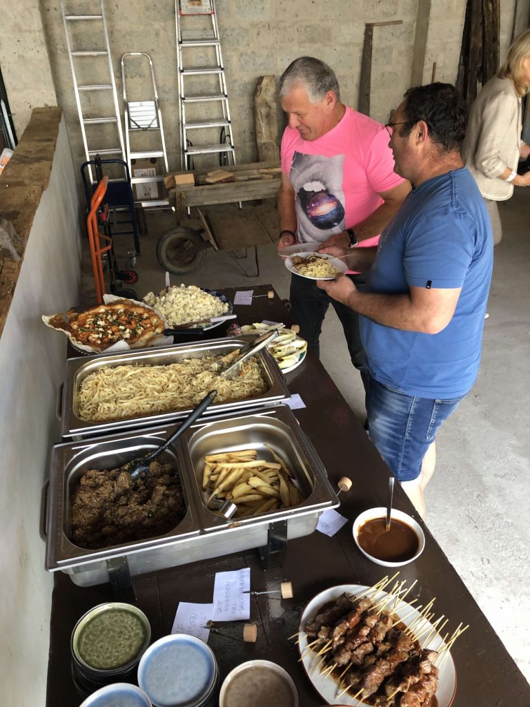 Halverwege de maand hebben we een dejeuner voor de buurt georganiseerd als kennismaking/housewarming. Als je denkt dat we in the middle of nowhere wonen; echt niet dus, het voelt aan als de Graaf Florisstraat in Rotterdam, maar dan met huizen die wat verder uit elkaar liggen. We hadden alleen onze straat uitgenodigd et voila: zo zitten er 25 man aan tafel. Dat voelde als een warm bad en we werden overstelpt met lokale cadeautjes, kaas en zelfgebakken taart. Ik kookte voor de gelegenheid Thaise Tom Yam Kung, Indonesische rendang en saté, maar dan wat minder spicy dan we in Nederland, laat staan in Thailand of Indonesië zouden eten. Het beviel ze wel geloof ik, het was schoon op, evenals de Ottolenghi klassieker zoete aardappelgalette. Zoals ik al gewaarschuwd was: weet dat een lunch duurt tot dinertijd, en zo geschiedde. Ik had zo weer door kunnen gaan met het koken van de volgende maaltijd, en met gemak was iedereen nu nog steeds aan het eten. Misschien een partijtje petanque en een dutje tussendoor, even mais binnenhalen, maar verder gaat het de Fransen toch om sociaal zijn, eten en drinken, zo lijkt het. We vinden het prima zo en we voelen ons gezegend met zoveel lieve mensen om ons heen van diverse pluimage en leeftijden. De integratie gaat dus prima, Luuk heeft zelfs zijn eigen Baskische baret aangemeten. Ah, oui hè!