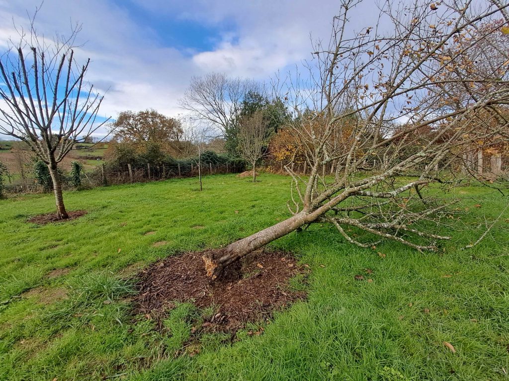 Maar afijn, hier de gevelde boom, hij had al onderliggende problemen, maar toch sneu. Luuk wil dat ik hem weghaal zodat hij gemakkelijker kan maaien (pfff!) maar ik vind het wel poëtisch, zo’n flauwgevallen soldaat in het cohort. En hij zit nog voor een deel vast aan de wortels, dus wie weet groeit er nog wat door.