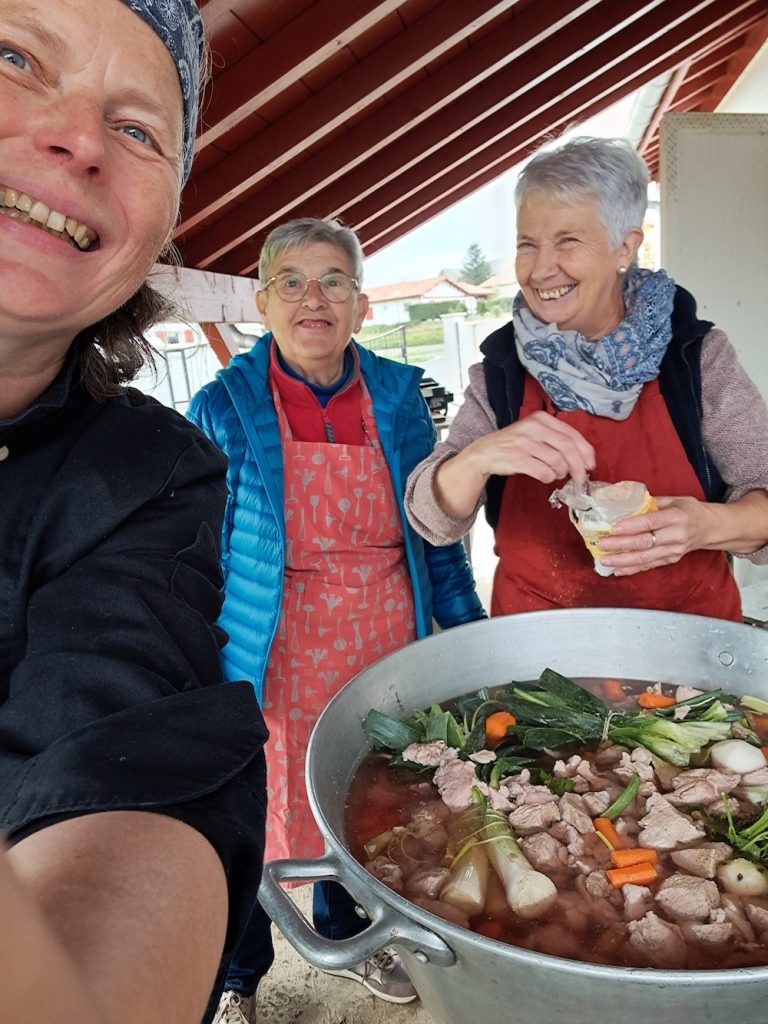 Terug in Domezain mocht ik voor het eerst aan de bak als hulpkok bij onze lokale ouderenlunch. Omdat de huidige keukenbrigade nogal wat ouderen heeft, is verjonging (merciekes!) hard nodig. Een enorme groep van zo’n 15 vrijwilligers komen dan samen, de een functioneel als kok, de ander als helpende hand of als morele ondersteuner. Uiteindelijk stond er voor die 15 personen een uitgebreide lunch klaar, was er een saaie voordracht over verkeersveiligheid, was er veel plezier en hadden we op traditionele wijze een blanquette de veau en een pompoensoep voor 60 mensen voorbereid voor de dag daarna. Ik werd die dag officieel toegelaten tot de vrijwilligersploeg: al die 60 mensen die de hand omhoog staken toen de voorzitter vroeg of ik toe mocht treden. Trots joh!